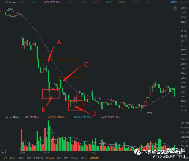 还是以这个例子来说明,当一波急速下跌,并且伴随着成交量放大的时候,说明多方进场抄底,此时空方就要注意了,接下来很容易会发生反转。如果此时你是在做空的,因为出现了不确定因素,为了不承担过多的风险,应该考虑止盈。