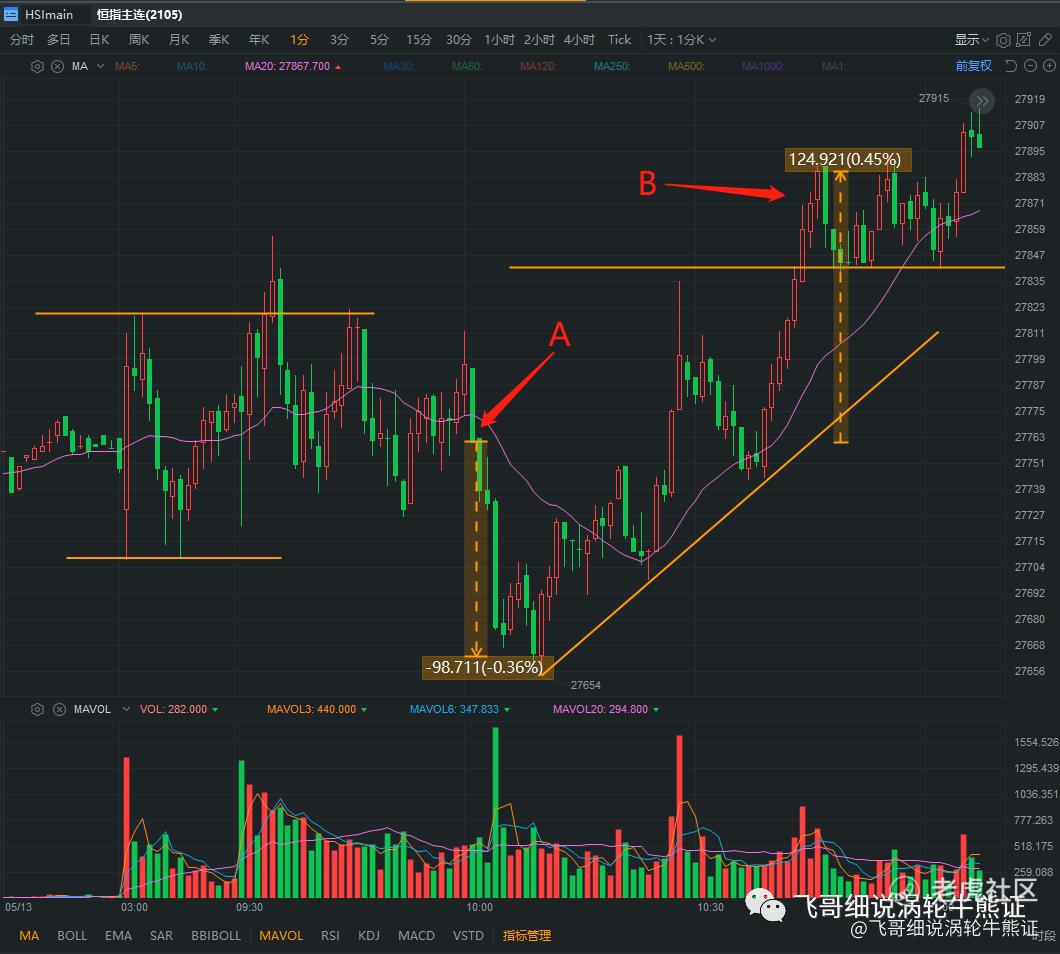 就像下图这种情况,当出现长阴线,形成吞没的形态,并且跌破20均线,买熊证入场做空。恒指主连随即下跌了将近100点,按照10点一格来换算,熊证有10格的获利空间。但是此时没有止盈,之后指数一路向上,如果一直持有至B点,亏损幅度就会多达12格,让人十分痛心。
