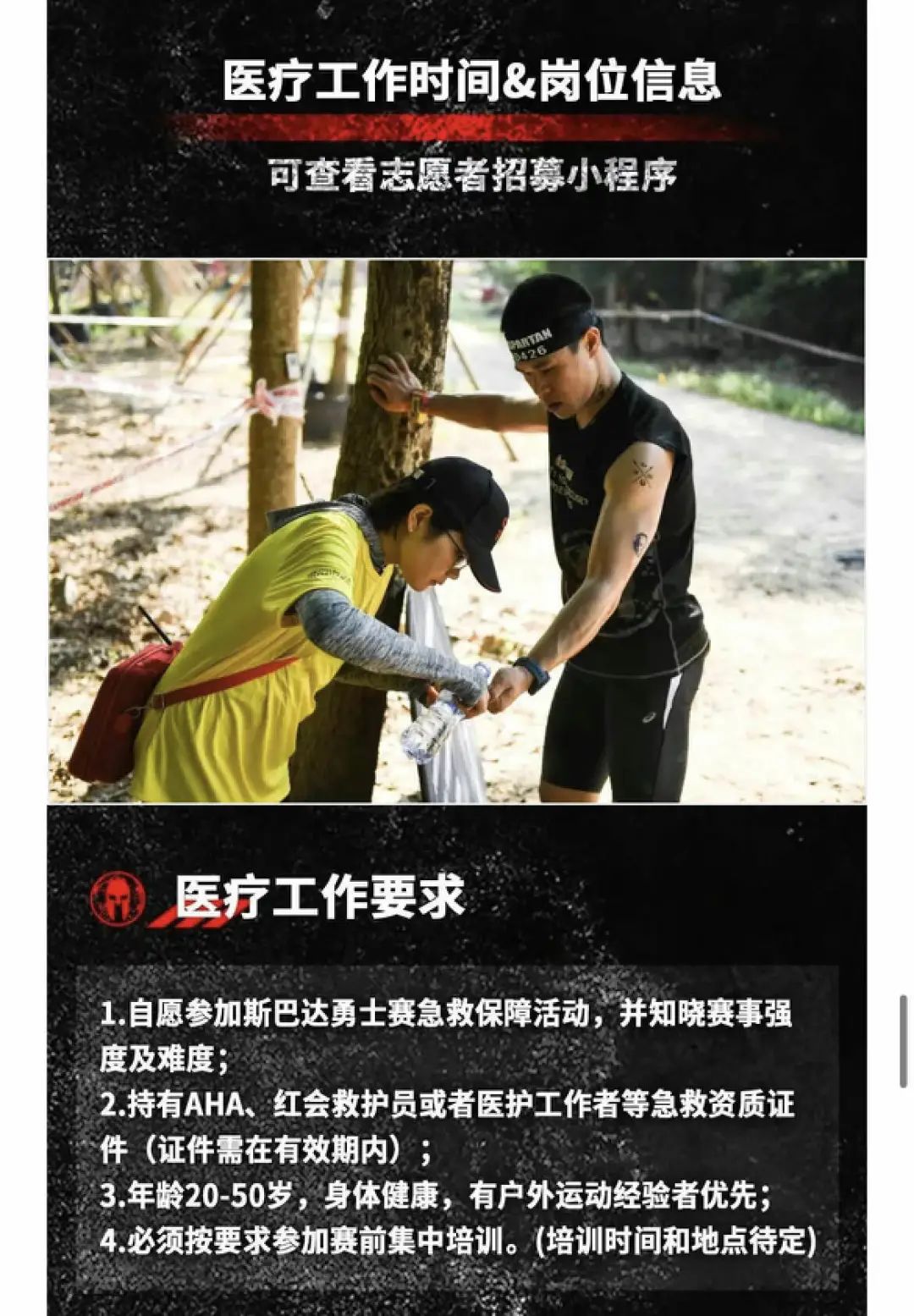 在斯巴达勇士赛的官方公众号中,有一条挂在显眼位置的志愿者招募信息,每一场比赛都有赛事志愿者、裁判、甚至医疗的招募岗位放出,每个岗位有不同的招聘要求。