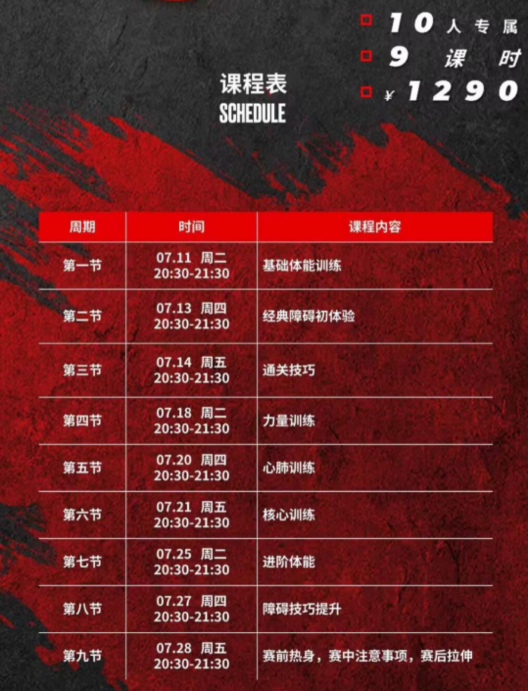 攀、跑、跳的核心项目构成使得比赛对参赛者上肢和臀腿力量的要求较高,要同时完成公里长跑,有氧训练也是必不可少。