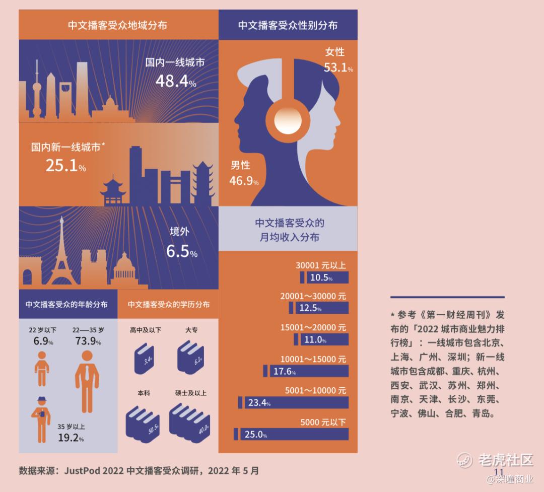 《2022中文播客新观察》数据显示,中文播客听众平均年龄30.2 岁,一线城市占比 48.4%,月均收入14808元,硕士及以上学历占 40%,女性播客受众占53.1%。