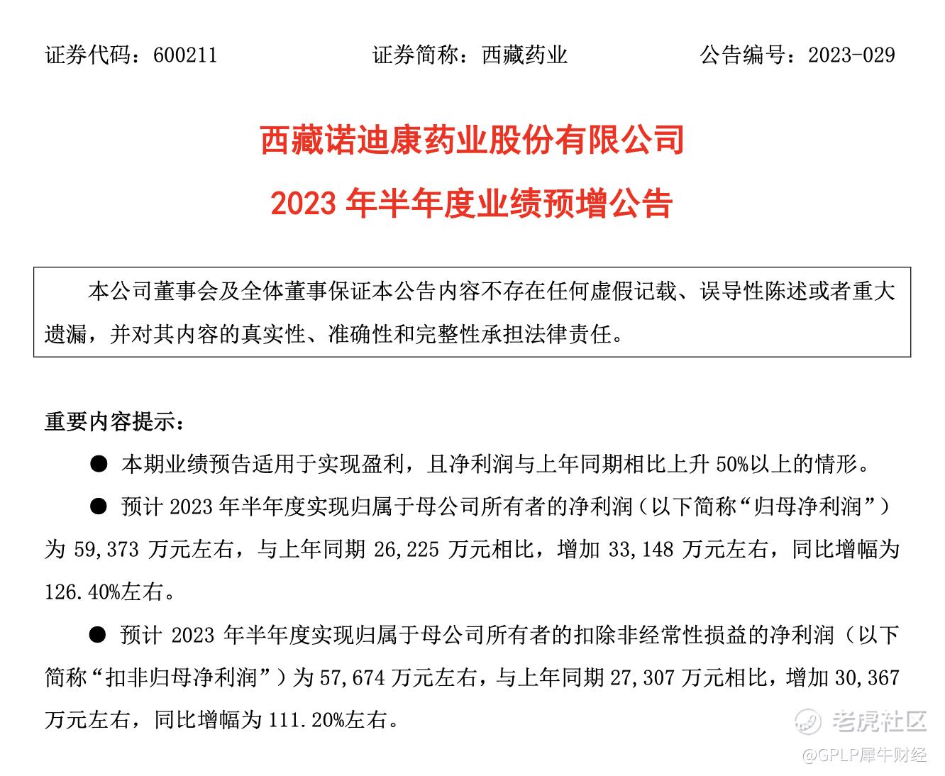 【西藏药业:预计上半年净利润为5.94亿元左右】西藏药业公告,预计上半年净利润为5.94亿元左右,与上年同期相比增加3.31亿元左右,同比增幅为126.4%左右。报告期内,公司产品销量增加;财务费用同比减少。(公司公告)