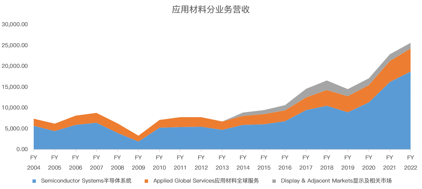 其主营业务主要分为3个模块:半导体系统(Semiconductor Systems)、应用材料全球服务(Applied Global Services)、显示及相关市场(Display and Adjacent Markets)。其中占据收入大头的半导体系统主要销售开发、制造和销售用于制造半导体芯片的各种设备,包括沉积 (CVD、PVD 等)、离子注入、刻蚀、快速热处理、化学机械平整、计量检验等。全球服务模块主要提供一系列提高晶圆厂效率的解决方案以及软件服务,显示器相关业务主要生产用于制造LED、OLED 和其他显示器件的设备。
