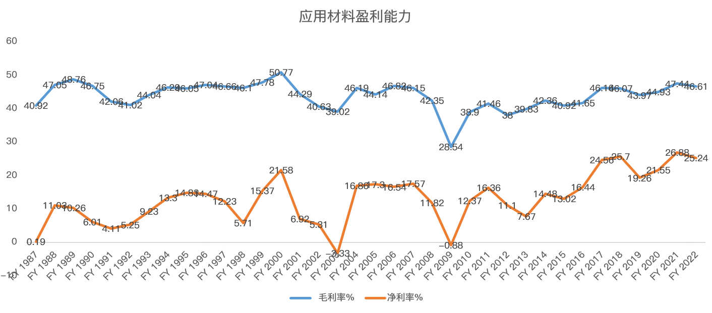从盈利能力上看,应用材料的毛利率在46.6%左右,净利率高达25%,盈利能力极强,也反过来证明公司的技术实力处于垄断地位: