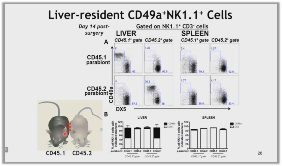 但是组织驻留的NK细胞,是不会随着血液循环流动的,经过验证,肝脏中确实存在组织驻留细胞,因为它们没有在两个小鼠体内互通。