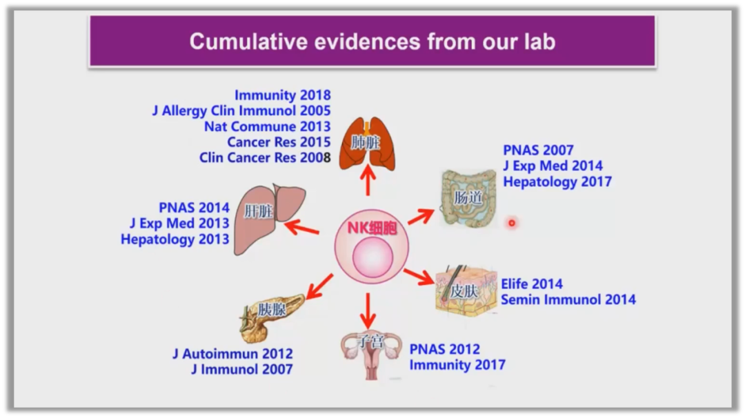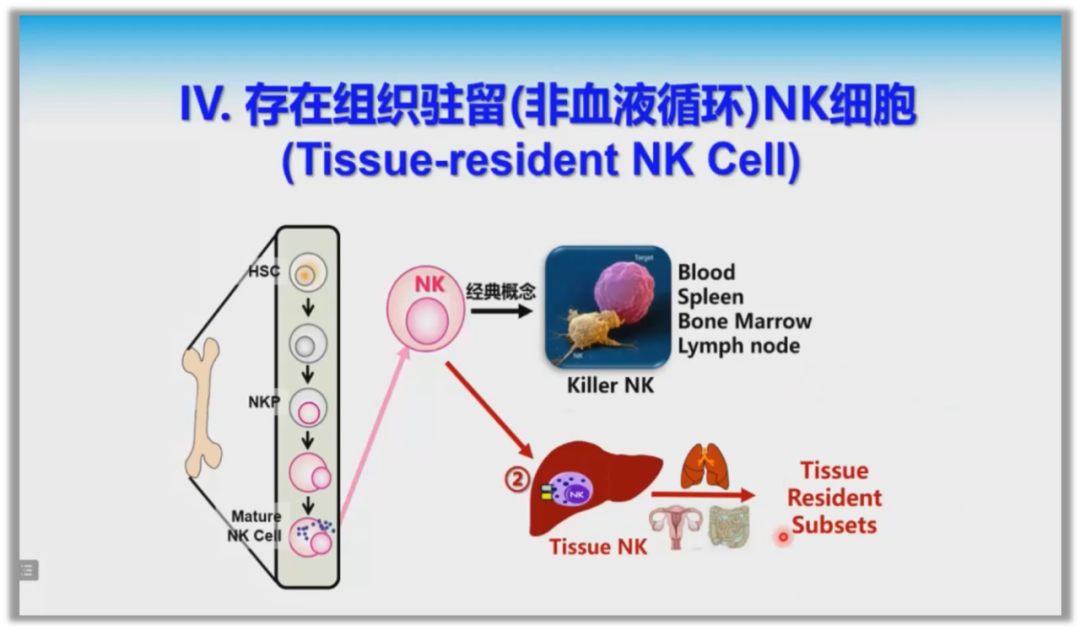 而田院士团队研究发现有NK细胞不仅在血液循环中存在,而且还在机体重要的组织器官中驻留,例如非经典的免疫器官肺、肝、肠、子宫等脏器,这就是组织驻留的NK细胞。