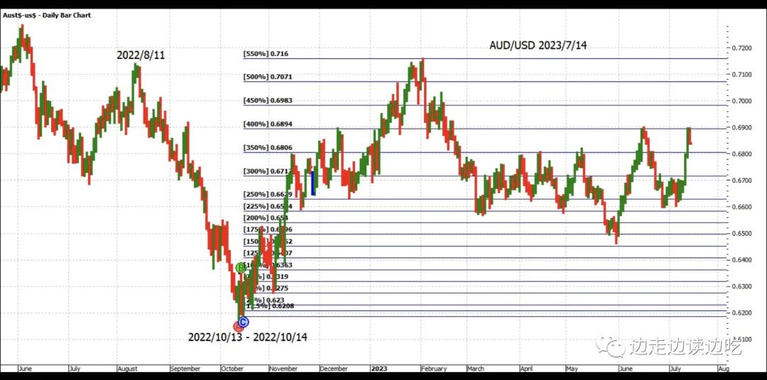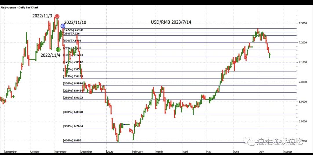 美元/人民币跌至100%阻力位止跌,收盘高于开盘。