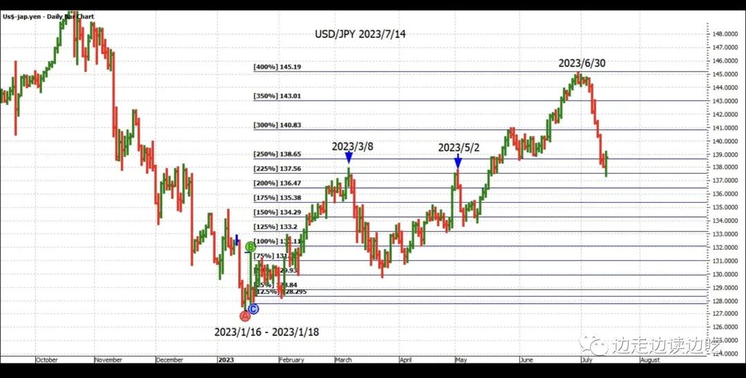 3. USD/JPY encountered a 400% resistance level on 30/06/2023, fell to a 225% support level yesterday, and reversed its direction by breaking through Thursday's high on the same day. Additionally, this upward movement aligns with two previous peaks observed in March and May.