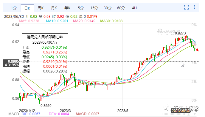 基本上港币对人民币的汇率在7月1日开始就陆续开始下跌,这意味着人民币升值,对于主要在境内开展业务的中概股或者港股资产来说,就意味着以港币计价的利润将回升,有利于港股资产股价的上涨。