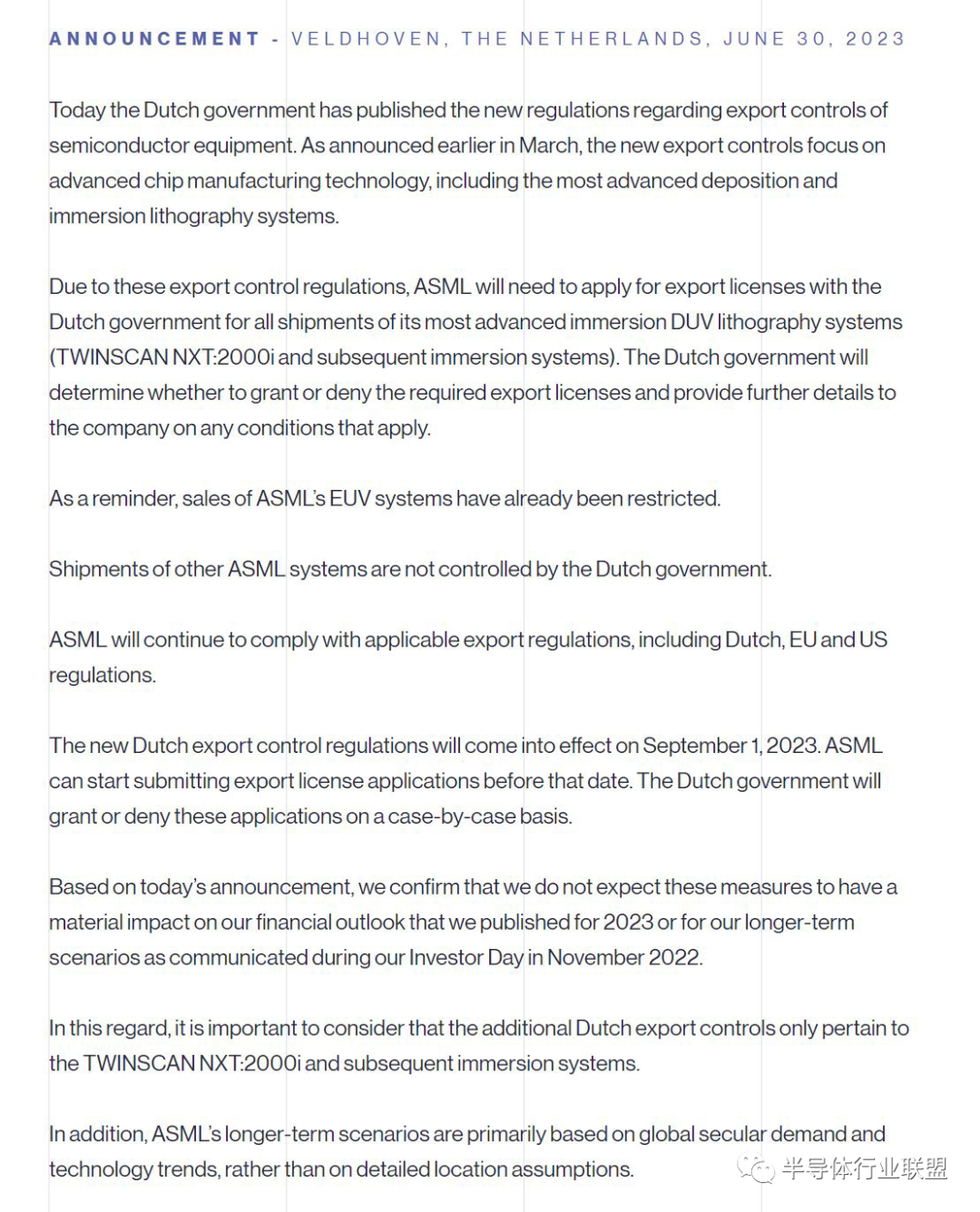 ASML回应称,NXT: 2000i和后续浸没式系统的出口需要申请,其他不受限制;预计不会对财务产生重大影响。