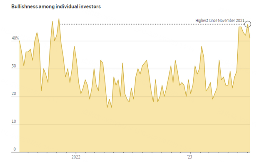 美国散户投资者协会调查显示,散户看涨情绪创下自2021年以来的高峰。