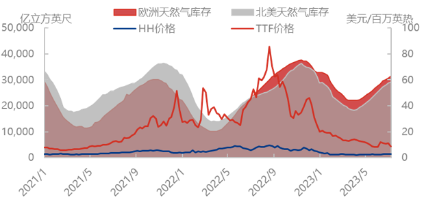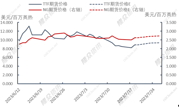 TTF期货价格将呈下降趋势。欧洲天然气库存增速小幅增加,但区内天气炎热,气温升高导致天然气发电制冷需求有所增加,预计TTF期货价格将有所上涨。