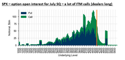 我们可以看到一个重要的信号—— $标普500(.SPX)$ 的期权已经出现了一定右偏,大量的Call集中在了4500左右,并且用作Cover的Call大量的跑到了价内(ITM)。