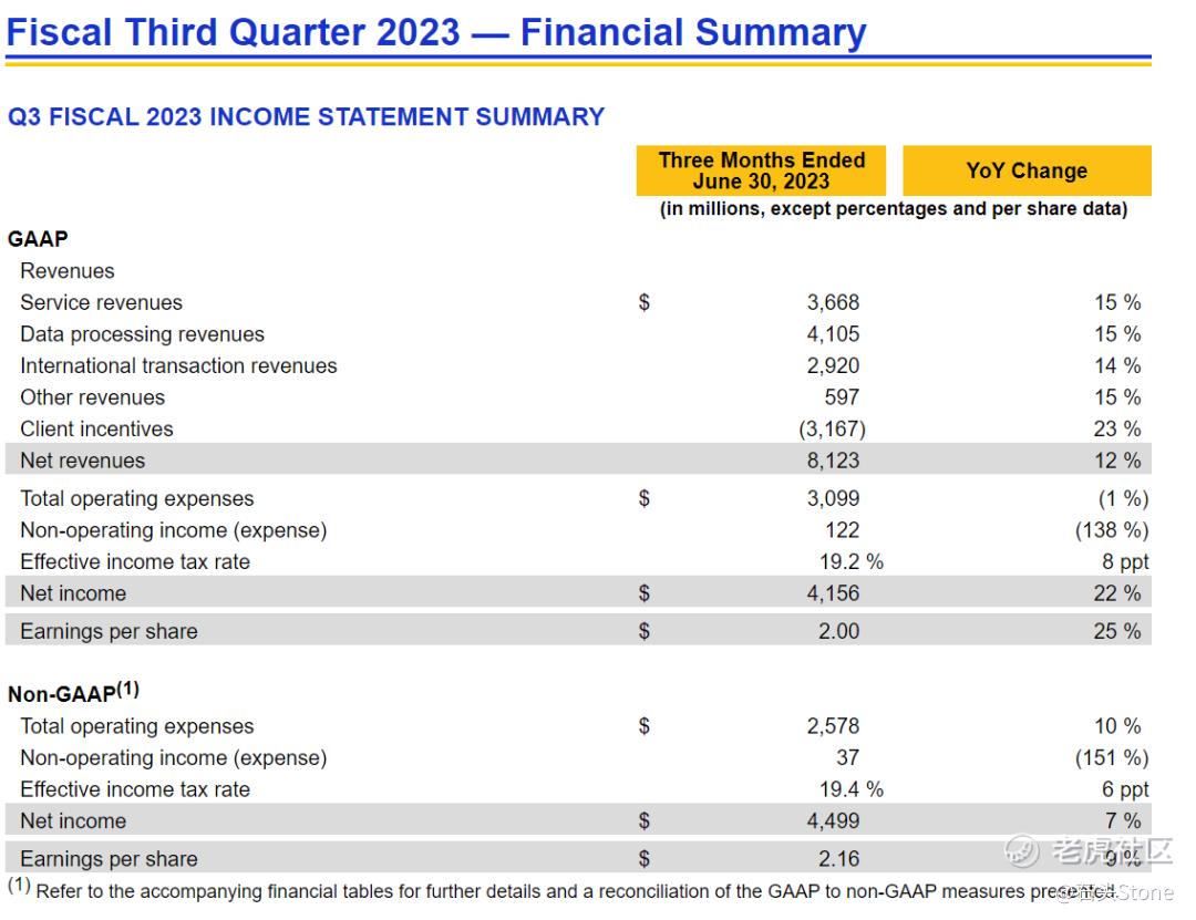 注:Visa公司在自然年为2023年第二季度公布的财报,在公司的财年中被标记为2023财年第三季度,以下可能会出现诸如第三财季等标记财报周期的字样,并非笔误。