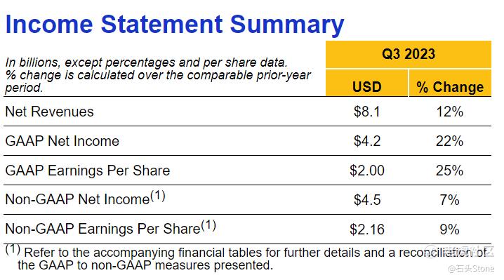第三财季的GAAP净收入为42亿美元或每股2.00美元,分别比去年同期增长22%和25%。