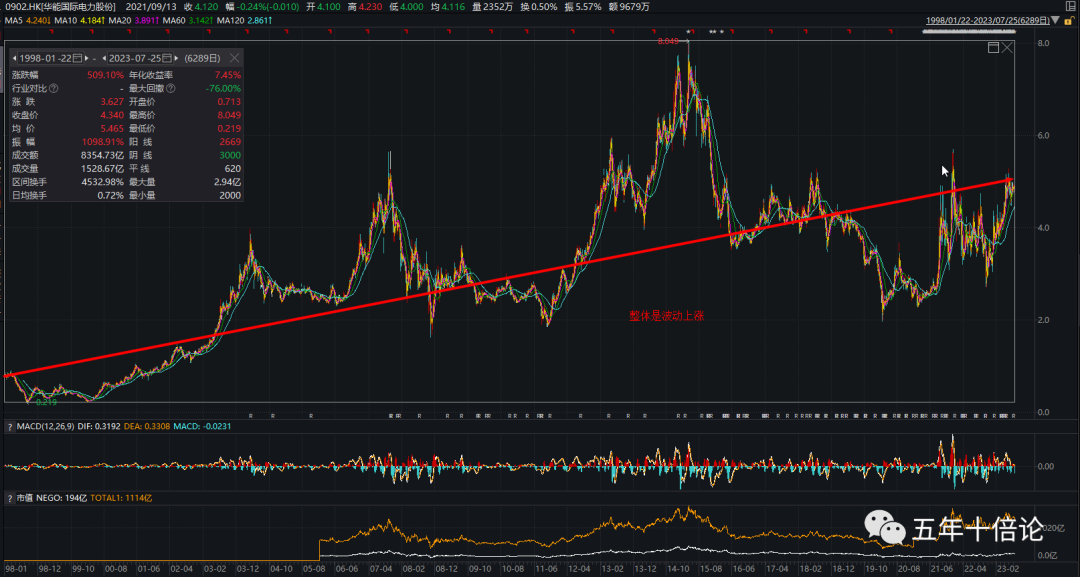 从2021年、2022年的净利润表现看,由于俄乌冲突,全球能源价格高企,华能国际因为要承受高价的煤炭成本,因此实现了亏损,今年因为煤炭价格下跌,所以实现了净利润的爆发式增长,当前应该是属于突破了下行周期底部,迎来了上行周期。