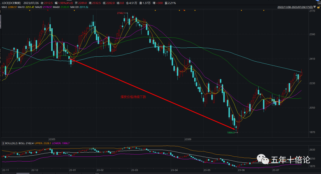 (1)煤炭价格在上半年持续下跌。通过查询煤炭期货价格,发现煤炭基本是国内在2023年的上半年是处于趋势性下跌的状态(如下图),这非常有利于华能国际降低成本,从而增厚利润。