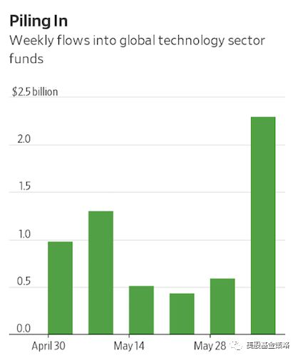 进入5月,全球流入科技板块基金的资金每周都呈现正流入,特别在月末美国科技股一波拉升后,更是一周超过20亿美元。