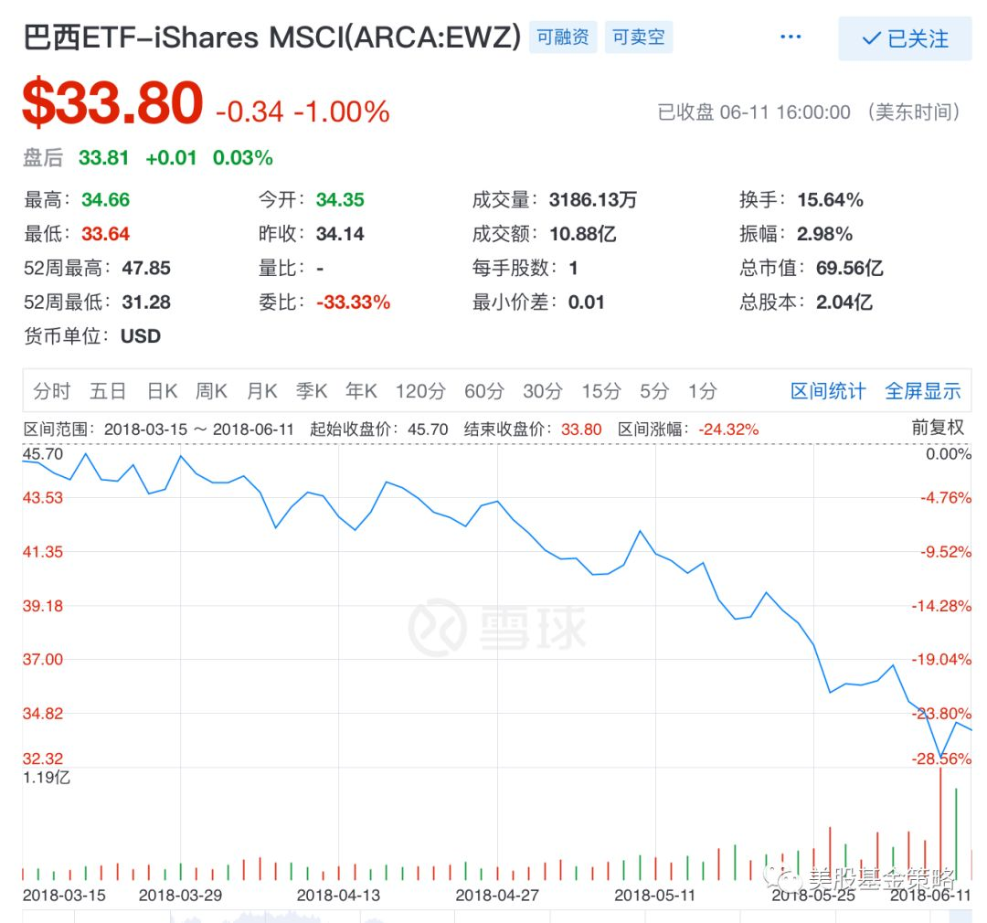 巴西市场这叫什么情况?股汇双杀!那么对于美国市场投资者就有得玩了,因为美国股市既有做多巴西股市的ETF,也有做空巴西股市的ETF,而且还加了杠杆。$(EWZ)$