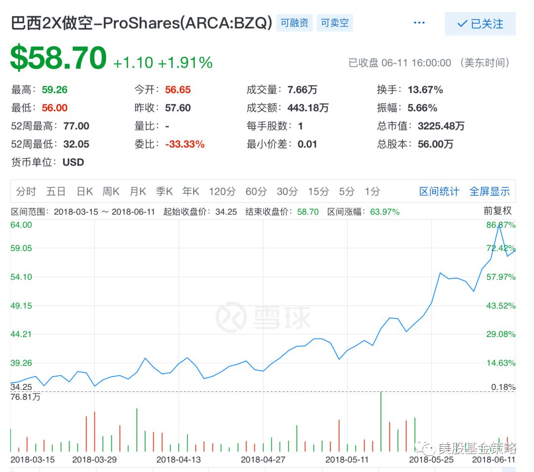 这种情况下,两倍做空巴西股市的BZQ,那就爽歪歪了,3个月涨幅一度达到了86%。但是,杠杆有风险,最近巴西市场一度有所缓和,这BZQ跌起来幅度也会很大。