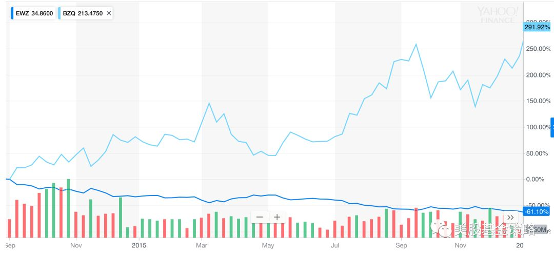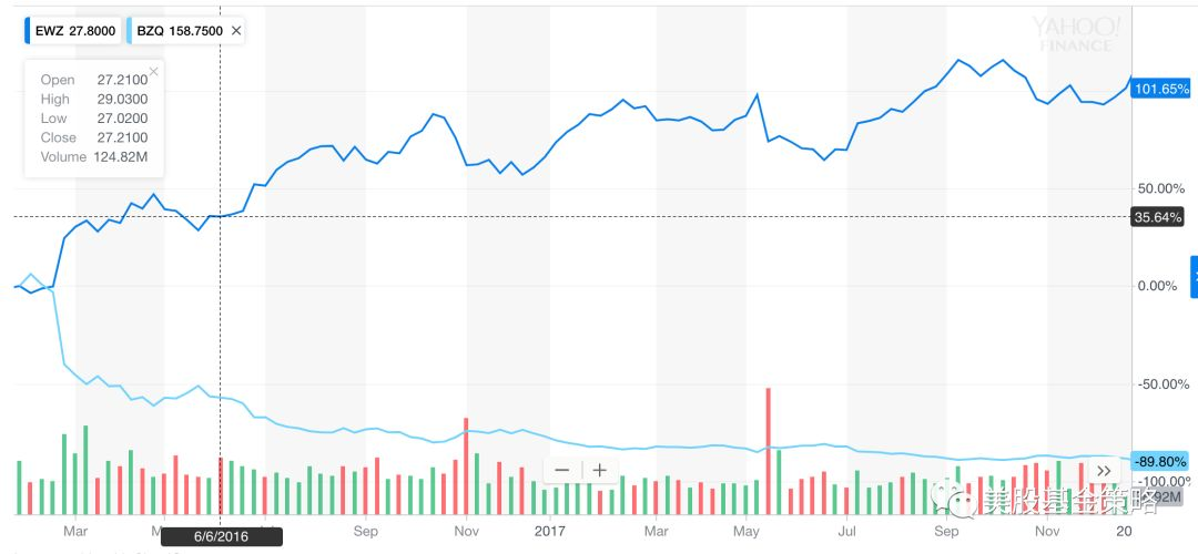 我们再看看2016年2月到2017年底的对比,2016年2月,罗塞夫已经众叛亲离,政治上被抛弃和进入弹劾正在成为现实,所以那个时候巴西市场就开始反弹,进入2017年我们知道是全球股市兴奋年,新兴市场尤其突出,巴西股市自然表现出色。所以这个周期,EWZ翻了一倍,而BZQ则跌去近90%。