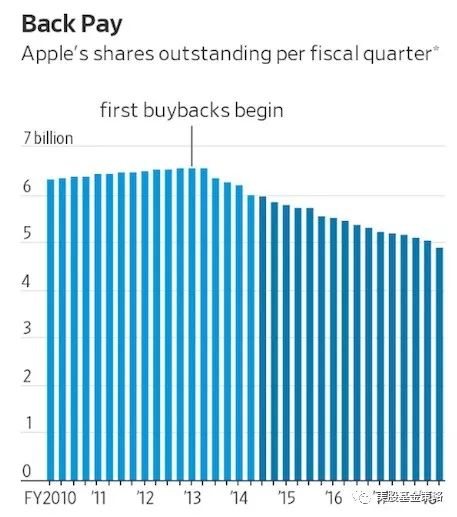 从苹果公司每个季度流通股的统计来看,自从2013年首次回购开始,苹果便气势如虹停不下来,而苹果的流通股数量也很有节奏的降低到50亿股以下。当然,你会发现这是一个流通股减少,股价提升的过程,对市值实际上没有本质影响,但是回购股票的公司,如果业绩也是不错的,通常会得到投资者,特别机构投资者的青睐。