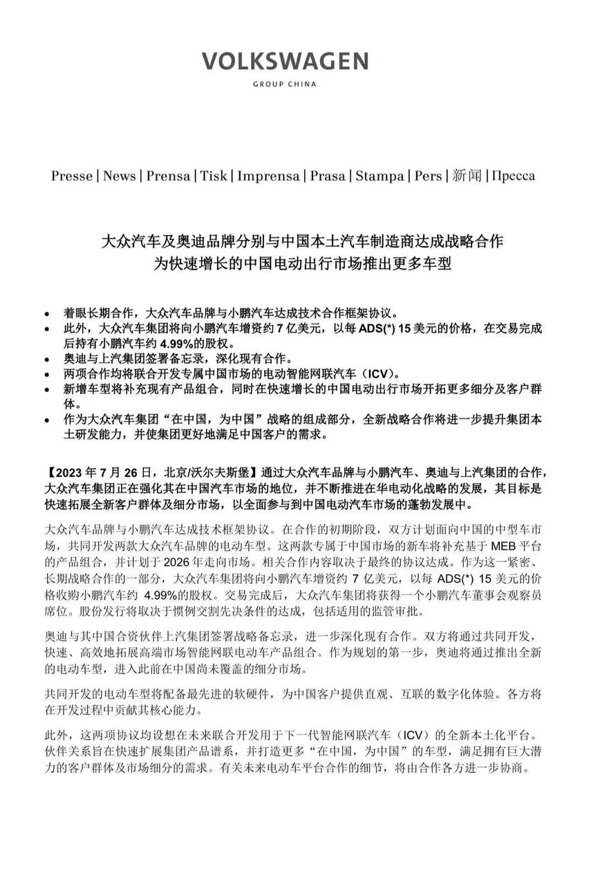 原来是出了个重大利好:大众汽车集团将向小鹏汽车增资约7亿美元,以每ADS15美元的价格收购小鹏汽车约4.99%的股权。