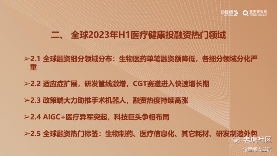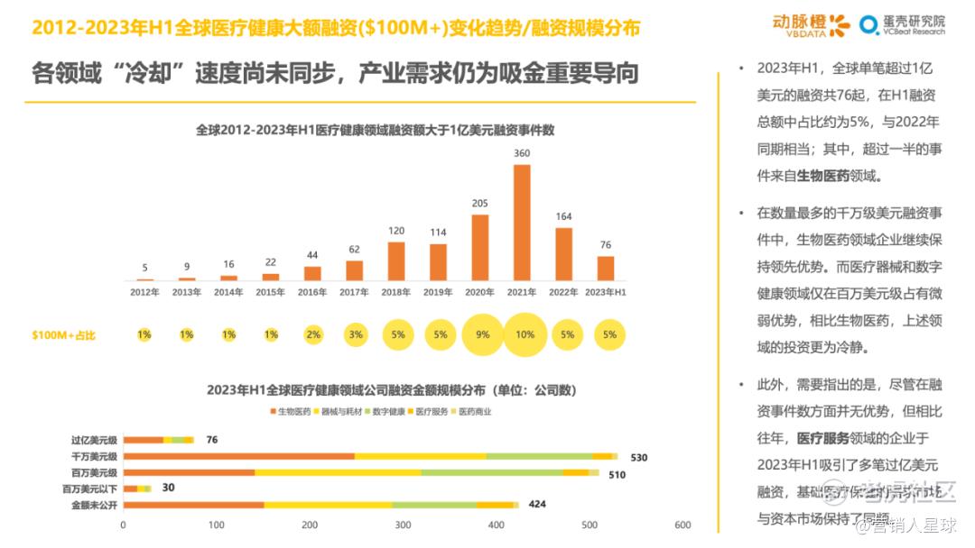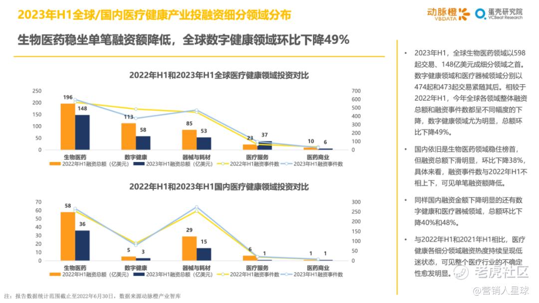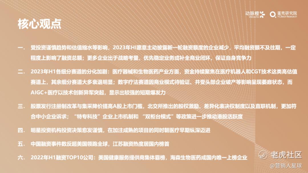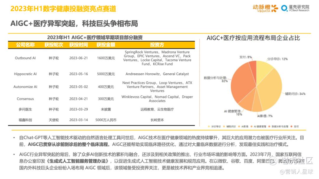 -2023年H1各细分赛道的分化加剧:医疗器械和生物医药产业方面,资金持续聚焦在医疗机器人和CGT技术这类高估值赛道上,其余细分赛道大多衰退明显;数字疗法赛道因南业模式待验证,并受头部企业破产等影响呈现萎靡状态,而AIGC+医疗以技术创新异军突起,显示出较强的短期爆发力