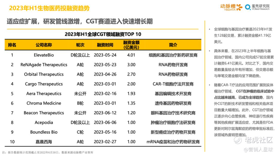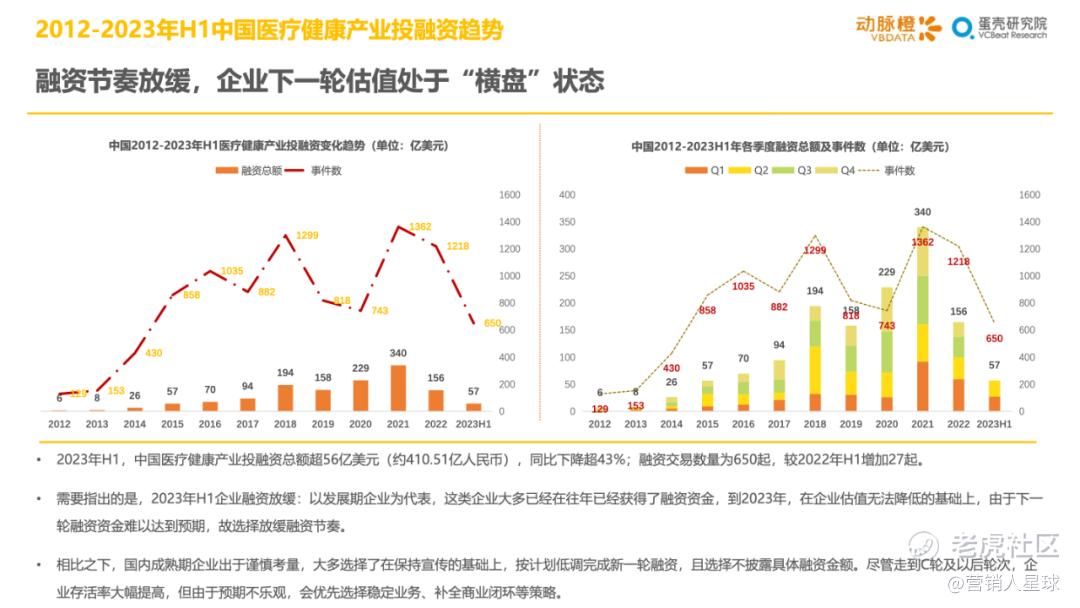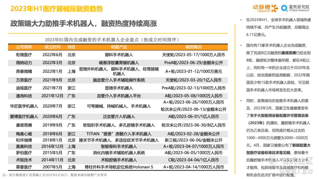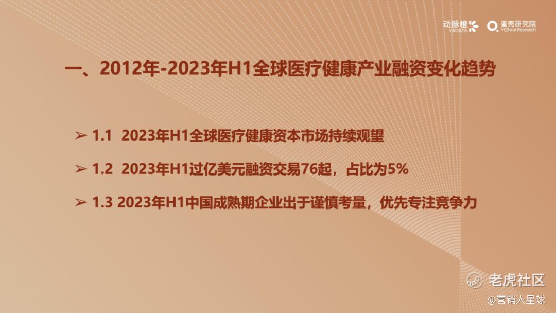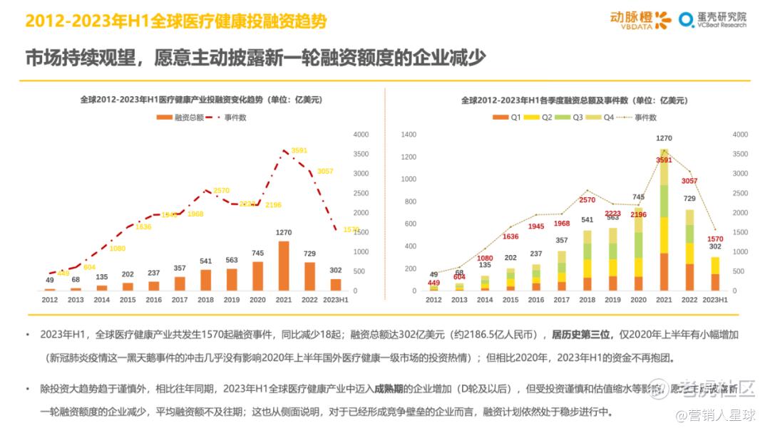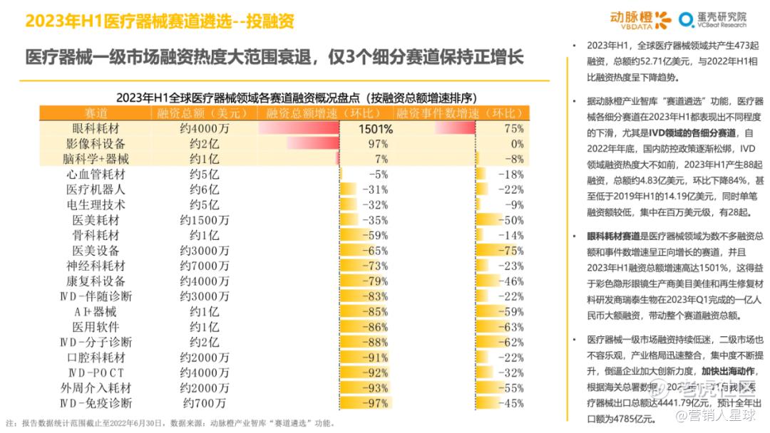 -2023年H1各细分赛道的分化加剧:医疗器械和生物医药产业方面,资金持续聚焦在医疗机器人和CGT技术这类高估值赛道上,其余细分赛道大多衰退明显;数字疗法赛道因南业模式待验证,并受头部企业破产等影响呈现萎靡状态,而AIGC+医疗以技术创新异军突起,显示出较强的短期爆发力