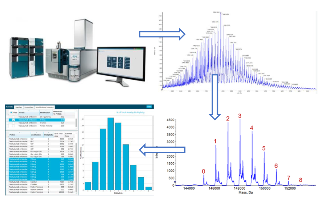 一般而言,小分子具有与抗体不同的最大紫外吸收波长,当多个小分子与抗体偶联后,可通过消光系数分别计算溶液中抗体和小分子的摩尔浓度来计算DAR值,但是这种方法容易受到溶液中游离小分子的干扰。另一方面,小分子的极性一般比抗体分子小,使得抗体分子在偶联不同数量的小分子后,其疏水性也呈现不同分布,因此会使用疏水作用色谱或反向色谱分离不同载药数量的抗体分子,但是通过这种方式获取的谱图,也需要进一步鉴定后才能用于检测。基于质谱的DAR值检测则是依据抗体偶联上不同数量小分子后分子量的变化来进行分析的,这类方法对仪器设备就有更高要求。另外,还存在不同载药分子离子化效率不同的问题。