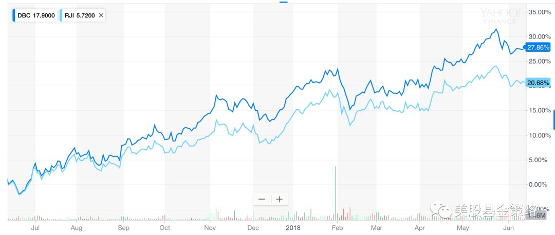 而从著名的商品ETF:$(DBC)$过去一年和RJI的走势对比来看,$(RJI)$也输了7个点啊。