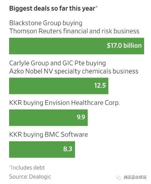 今年以来,可以看到,私募股权收购行业的巨头黑石、KKR、凯雷都有出手,黑石170亿美元收购汤森路透是目前最大的一笔收购。