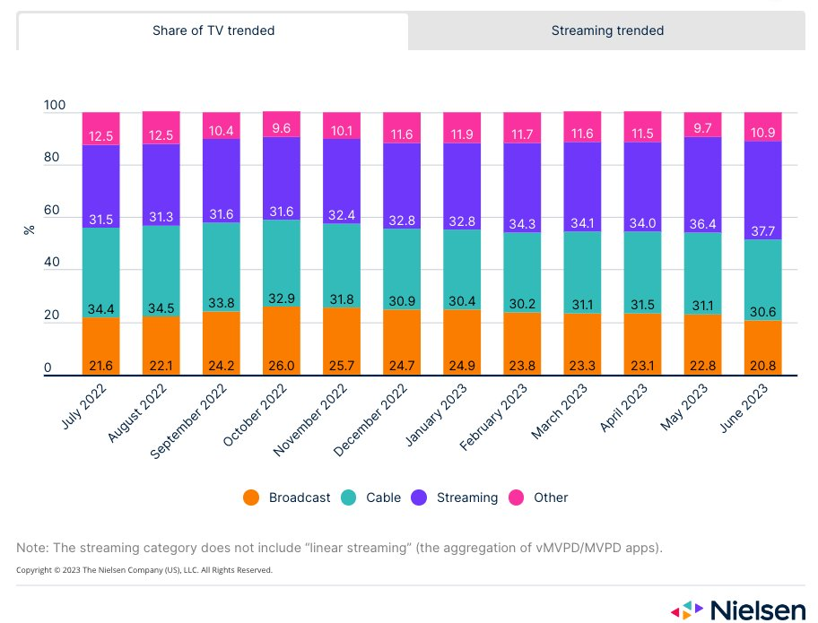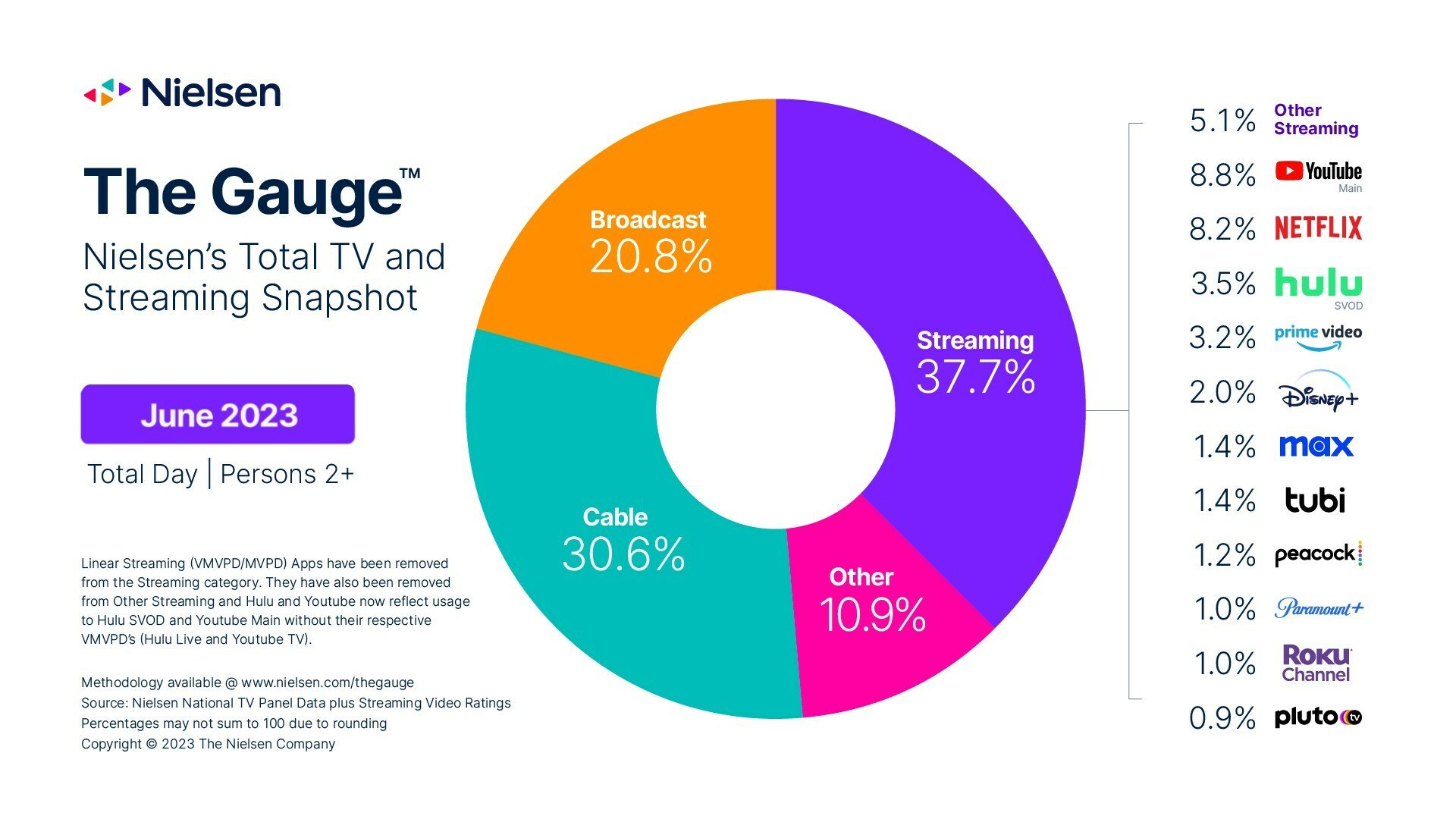 尼尔森现在从流媒体(虚拟多频道视频编程分销商或“vMVPD”)中排除了YouTube TV和Hulu Live。根据新方法,流媒体的份额为37.7%(+1.3pp M/M)。