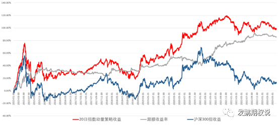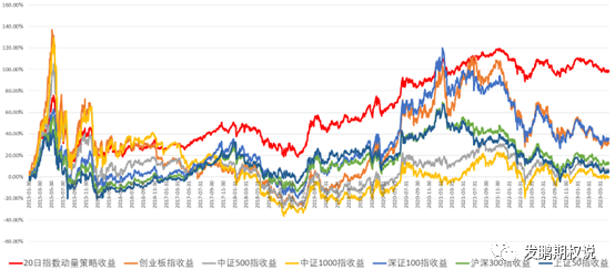 红色线为20日指数动量轮动策略收益率走势,最终达到约100%,显著超越上述任一指数。对比长期指数投资最普适的沪深300指数,20日指数动量轮动策略的超额收益率超过80%。