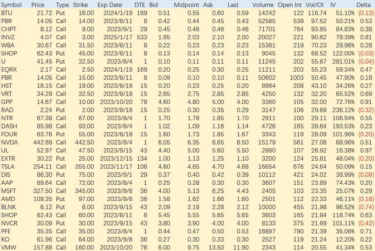 大科技公司方面,由于 $苹果(AAPL)$ 和 $亚马逊(AMZN)$ 马上要迎来财报,因此大单异动反而比较少。公布过财报的 $微软(MSFT)$ $特斯拉(TSLA)$ $英伟达(NVDA)$ $Meta Platforms(META)$ 倒是有更多的活跃交易。不过多见于一些保护性的交易,例如NVDA的covered Call也更集中到了平价的位置、355美元cover的三个月到期的特斯拉call等等。