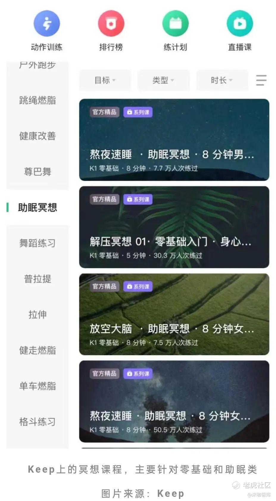 2016年开始,国内开始出现一批冥想产品,目前国内线上平台的冥想产品主要有两类,一类是垂直类产品,如FLOW、NOW、潮汐等专门针对冥想产品开发的APP,这些APP中包含了冥想课程、直播、会员打卡等,内容更聚焦,适合用户的深度学习,这些产品的主要收入来源是会员费和付费精品课程。另一类产品则是综合类产品的分支,比如喜马拉雅、Keep上都有冥想课程,内容较初级,对于大多数普通用户来讲,这种综合类产品的入门课程足以满足他们的需求。