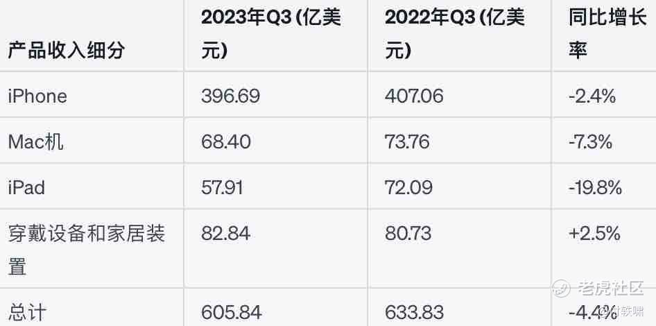 产品收入方面,iPhone、Mac 机和 iPad 的销售均出现下跌,分别跌幅为 2.4%、7.3% 和 19.8%。这可能与全球经济环境的不稳定以及供应链问题有关。然而,穿戴设备和家居装置产品收入增长了 2.5%,达到 82.84 亿美元,是惟一录得增长的产品。尽管有增长,但仍低于预期。