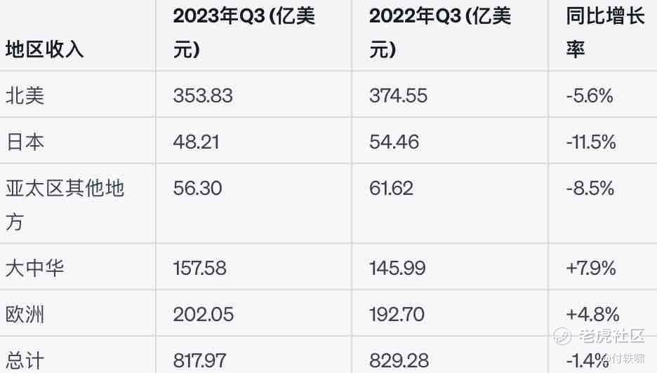 以地区收入划分,北美收入下跌 5.6%,日本收入跌 11.5%,亚太区其他地方收入跌 8.5%。而大中华及欧洲收入分别增长 7.9% 和 4.8%。这表明,公司在不同地区的业绩表现存在差异,全球经济形势的不稳定可能对一些地区的销售产生影响。