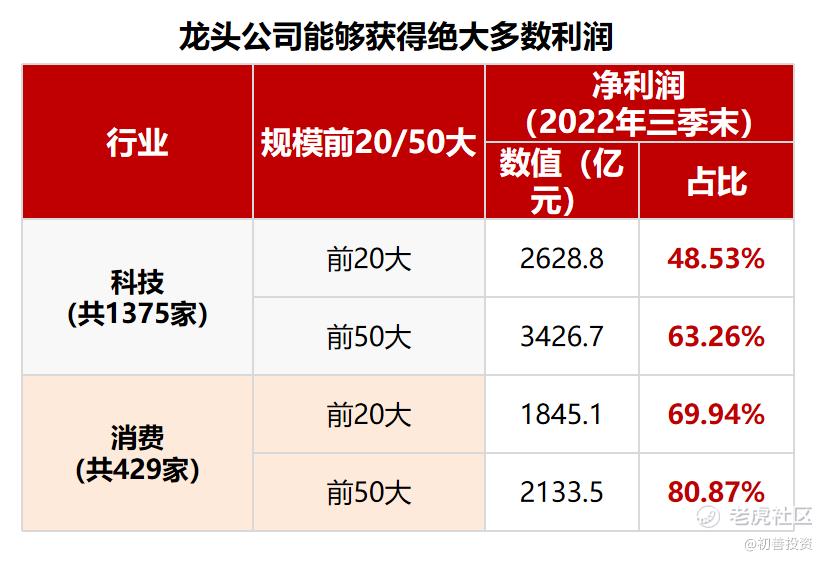 以A股的科技和消费公司为例,A股科技领域中前20家公司(对比1357家)数量占比仅1.5% ,却占据了48.5%的净利润;A股消费领域中前20家公司(对比429家)数量占比仅5%,却占据了近70%的净利润。同时,龙头公司的市值占行业的市值比例也会持续提升,龙头公司的股价涨幅在行业内也是最大的。