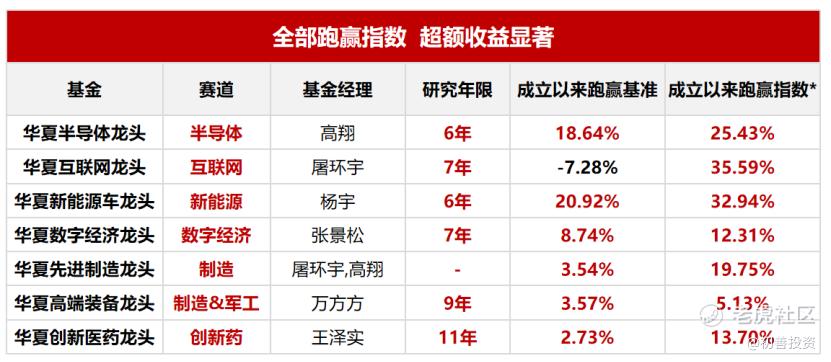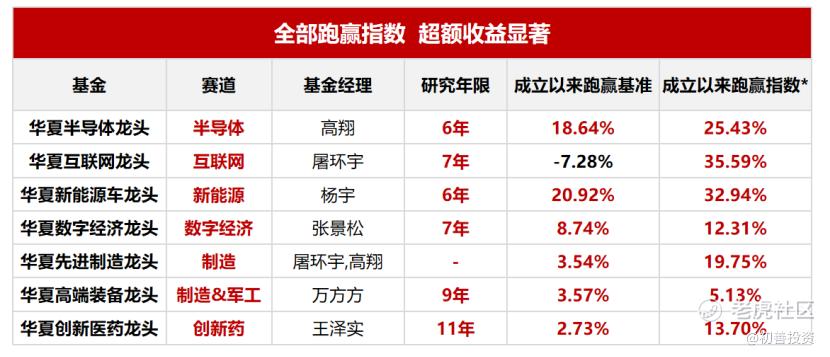 我最近一段时间刚好注意到一个主动管理系列基金全部跑赢指数,超额收益明显,这个系列叫华夏产业龙头系列基金。从收益数据来看,七只基金成立以来全大幅部跑赢指数,除互联网龙头外,全部跑赢基准,这意味着这些基金超额收益非常明显。