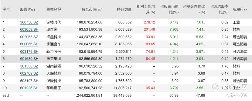 我们看看杨宇代表作华夏新能源车龙头。华夏新能源车龙头行业配置集中度较高,但前十大持仓权重较为均衡,截至2023年中报,前十大权重股合计权重为50.98%。从前十大持仓看,华夏新能源车龙头持仓重点覆盖动力电池、下游整车领域,前两大持仓宁德时代、璞泰来均已重仓较长时间,同时新增重仓祥鑫科技、宇通客车、拓普集团和华电重工。