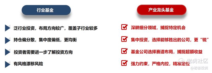 ETF属于指数基金,负责跟着行业指数,特点是持仓分散,集中度低,泛行业投资,布局广,一句话总结,行业指数有什么,基金就有什么。产业龙头基金属于主动管理基金,特点是集中度比较高,深耕细分领域,产业龙头产品追求极致的行业β和个股α。