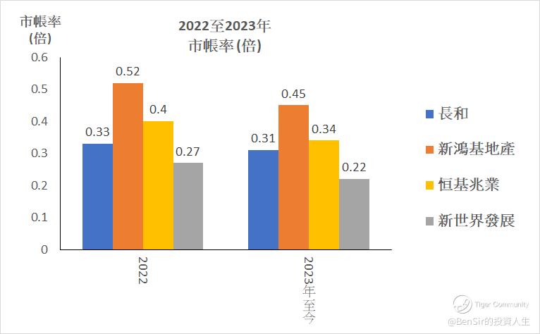 由于长和是重资产企业 (即公司有好多资产拿来生财),所以就利用市帐率作比较,数字愈少愈好 (当然再再看增长及盈利啦)。长和2023年市帐率是0.33,与其他三大家族相比估值尚可 (当然新世界发展又是另一个例外)。