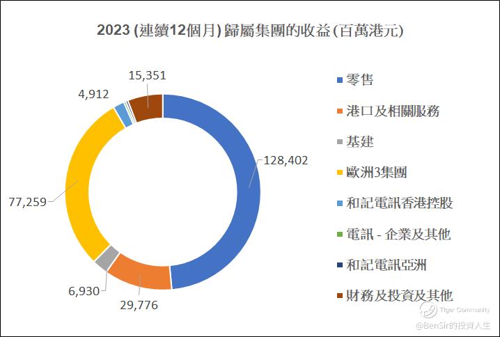 而上述板块,未计来自主要交易活动之收益净额及其他一次性项目的盈利分布则是零售 (2023年: 13.73%; 2022: 13.47%)、电讯 (2023年: 21.23%; 2022: 26.89%)、港口 (2023年: 14.56%; 2022: 14.88%)、基建 (2023年: 27.81%、2022: 27.13%)