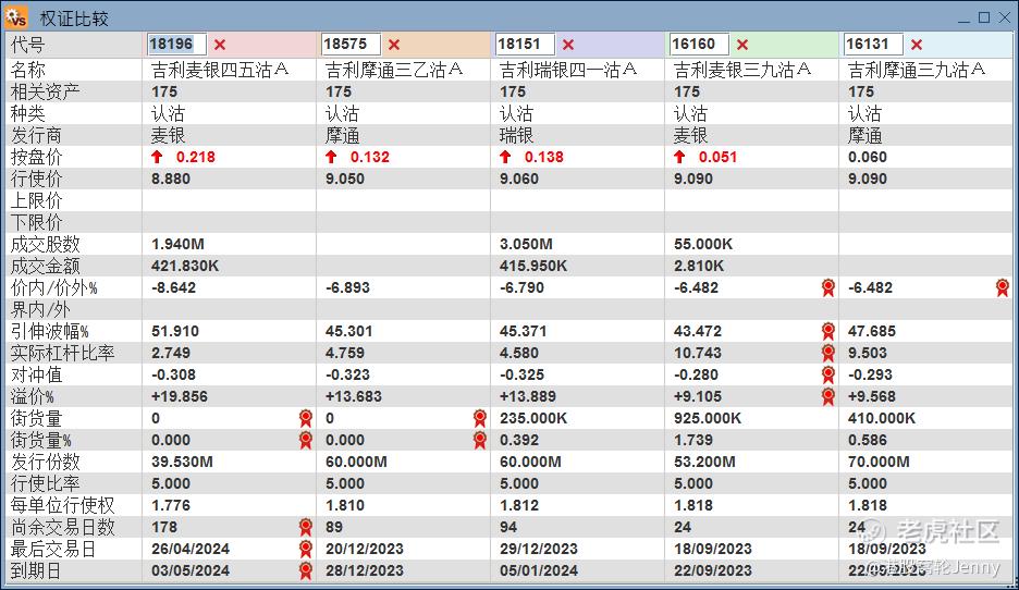 吉利汽车认沽证街货减少4.7%,2023年12月到期,价内10% 的认沽证街货增加最为明显;其次为2024年1月到期,价内10% 的认沽证为第二大街货增加产品。吉利汽车认沽证整体成交额减少75.8%。相关认沽证可考虑16131价外6.57%,注意到期日在9月22日;长期的则考虑18575,杠杆4.76倍。