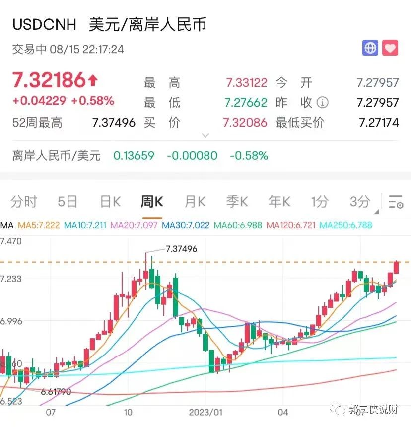 再加上近日国内公布多项经济数据不及预期,央妈下调中期借贷便利MLF及逆回购操作之中标利率,可以理解为降低中短期贷款利率,现在人民币短期利率2%,美元5.5%,这么大的利差资本自然选择持有美元,人民币汇率一路走低。