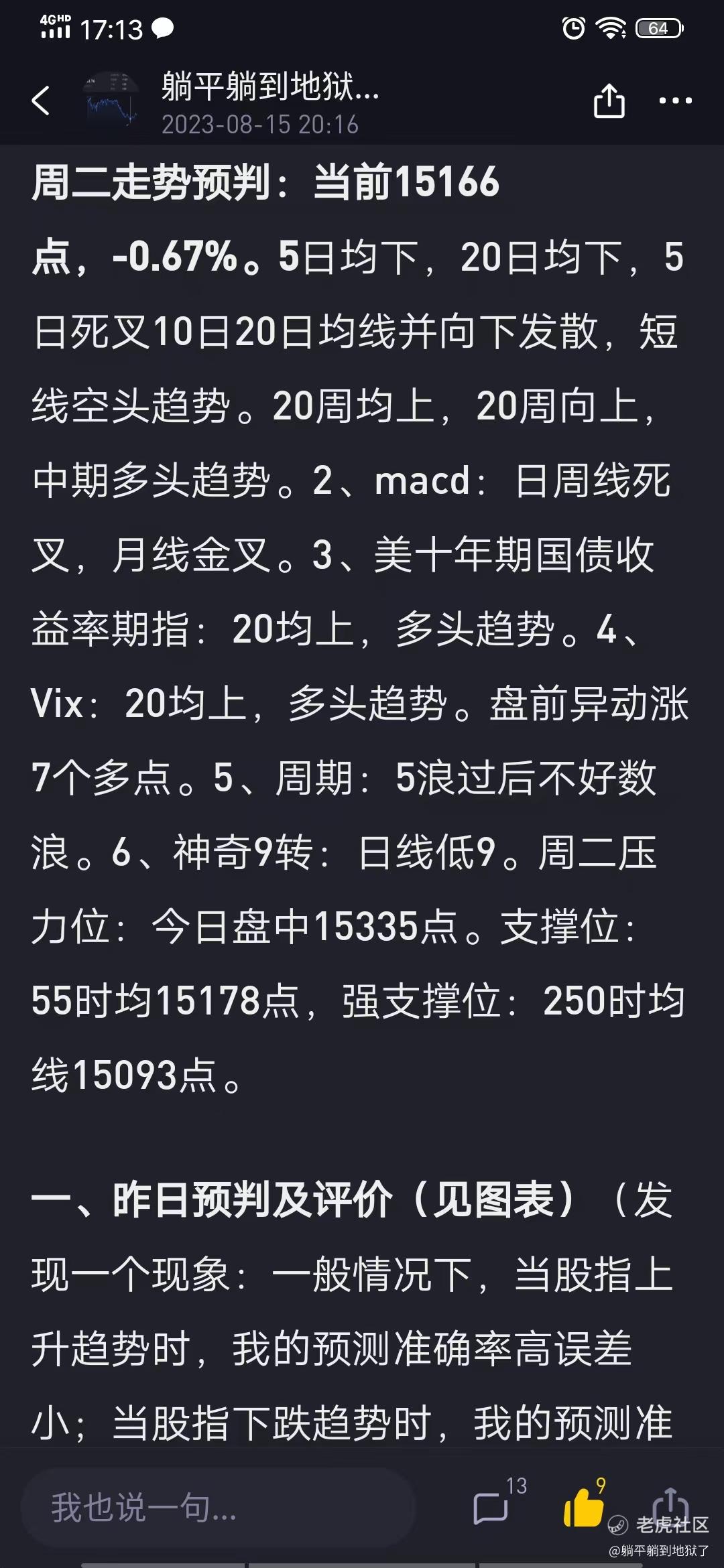 周三走势预判:当前15151点,0.30%。20日均下,20均向下,5日死叉10日20日均线并向下发散,短线空头趋势。20周均上,20周向上,中期多头趋势。2、macd:日周线死叉,月线金叉。3、美十年期国债收益率期指:20均上,多头趋势。4、Vix:20均上,多头趋势。盘前回落。5、周期:5浪过后不好数浪。6、神奇9转:日线低9后两天。周三压力位:10日均线15272点,强压力位:小时前高15335点。支撑位:前低15074.75点,强支撑位:前前低15020.75点。