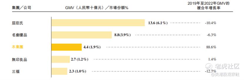 KK集团是一家专注于潮流零售店的运营,直接向终端客户提供各具特色的商品的公司。根据弗若斯特沙利文报告,按2022年的GMV计,KK集团是中国三大生活方式消费潮流零售商之一,同时也是前十大市场参与者中增长最快的潮流零售商,2019年至2022年GMV复合增长率为88.6%。