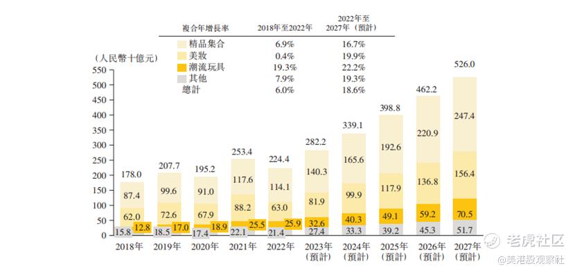 根据弗若斯特沙利文报告,中国生活方式消费品潮流零售市场具有巨大增长潜质。按GMV计算的市场规模近年来快速扩大,预计将从2022年的2244亿元增长到2027年的5260亿元,预计复合年增长率为18.6%。