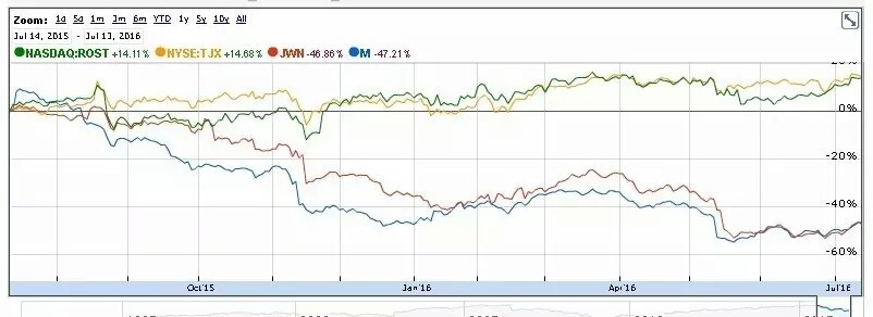 其实wholefoods的采购模式也有点类似,可惜它家卖得实在太贵。大家来看传统的百货公司和这些寻宝店的股价比较